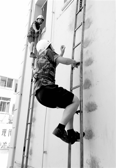 9月12日,市消防大队古城中队战士冒着高温进行挂钩梯训练。市公安消防大队全体官兵自9月初开始,以饱满的精神进行科学施训,并按照“十八大”安保要求开展各类应急训练活动。