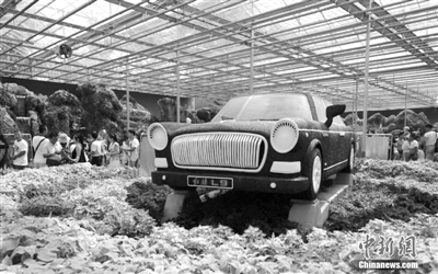 8月17日,在第十四届长春农博会创意农业园里,由数百万颗各种豆类和各种植物种子按1∶1制作的红旗L9惊艳全场,引来参观者拍照留念。