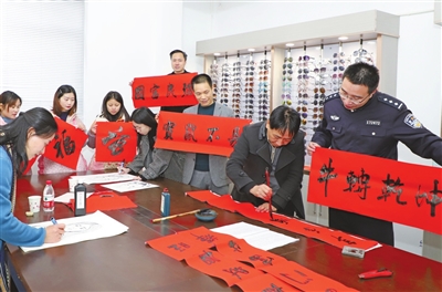 1月15日上午,杜桥派出所组织书画家、书画爱好者为留杜桥过春节的外来“打工人”写春联、画速写,祝愿他们过个好年。身在杜桥的一些外来“打工人”说,这些书画家、书画爱好者的举动,让他们心里感到很温暖,他们决定留在临海过年。 叶明銮摄