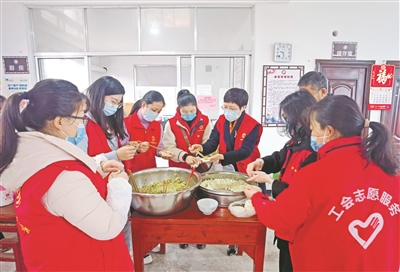 本报讯 (记者孙海康)3月2日,汛桥镇统高山村文化礼堂广场上热闹非凡,市总工会的志愿者们为村里的老人们理发、测血糖、量血压、修剪脚趾甲、拍摄笑脸照,还开展清洁家园、文艺演出等活动。中午,志愿者们又从食堂里端出热气腾腾的饺子,老人们围桌而食,现场暖意融融。