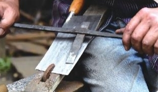 好书要经百回读,好铁要经三回炉。打铁看着简单,实际上里面的学问很大。从选材的样式,到红火时温度的控制、淬火时水的质地和温度以及锻打的位置,都很讲究。譬如嵌钢,有些人认为既然钢锋利,那不如用全钢刀,这样就不用这么麻烦地嵌钢了。其实不然。如果把钢比作人体的骨头,那铁就是肉,没有肉支撑的骨是走不长的。所以嵌钢很讲究,要视实际情况而定,不是钢嵌得越多刀越好。嵌好后的锻打也很讲究,首先要控制好后温度,必须使钢和铁能很好地融合在一起,铁包钢也要恰到好处;其次,用手锤适当敲打时,一来加固,二来检查钢料顶端与槽口距离,不能露出太多,也不能缩进太多,否则打成的刀具会出现纯钢头或钢太少,而容易卷锋或折断。这些,除了要肉眼辨别外,主要靠得是经验。