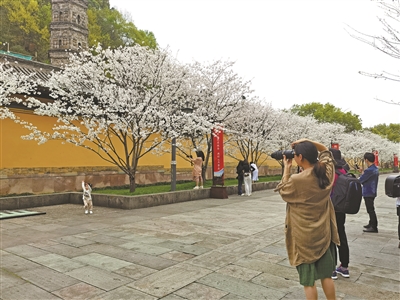 近日,台州府城文化旅游区的樱花盛开,进入最佳观赏期,吸引了市民游客前来踏青打卡。 李萍娟摄