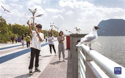 近日,云南省昆明市天气转暖,在春城越冬的红嘴鸥即将启程北往,游人纷纷来到海埂大坝,赏鸥送“友”。