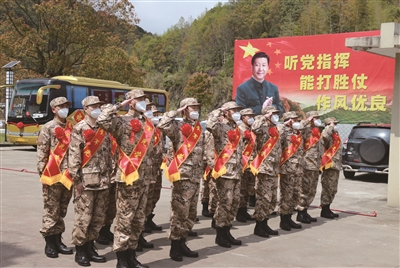 3月23日,我市149名春季新兵统一换上戎装,身披红绶带、胸佩大红花,从市民兵训练基地出发,奔赴军营,去实现报效祖国的理想。 杨 颖摄