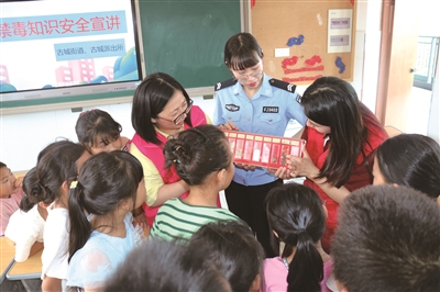 为深入推进青少年毒品预防教育,提高公众对毒品的认识,日前,古城街道禁毒办联合古城派出所走进鹿城小学,给参加公益暑期夏令营的小朋友们上了一堂别开生面的禁毒教育宣传课。宣讲员以通俗接地气的语言,耐心细致地向小朋友们讲述几种常见毒品的样子,并用一个个真实案例告诉大家吸毒的危害,切实增强师生们识毒、拒毒、防毒的能力,在校园筑起了抵御毒品的坚固防线。 金雅婷 郭婷婷摄